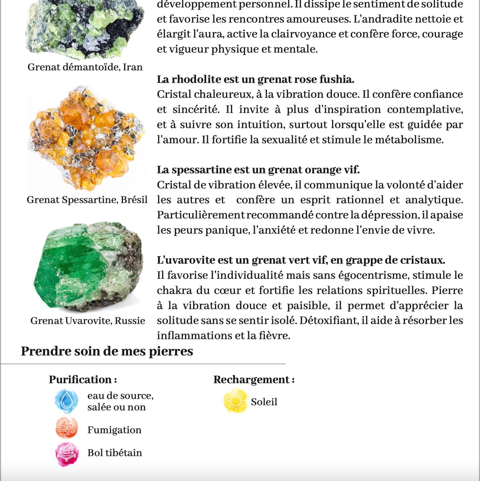 Vous y retrouverez les pierres avec leurs variétés quand elles existent (Tourmaline noire, verte, rose, bleue et melon d'eau ; Obsidienne noire, dorée, œil céleste, flocon de neige et larme d'Apache ; Grenat almandin, grossulaire, andradite, rhodolite, spessartine et uvarovite…), parce que chaque variété porte une énergie qui lui est propre.
