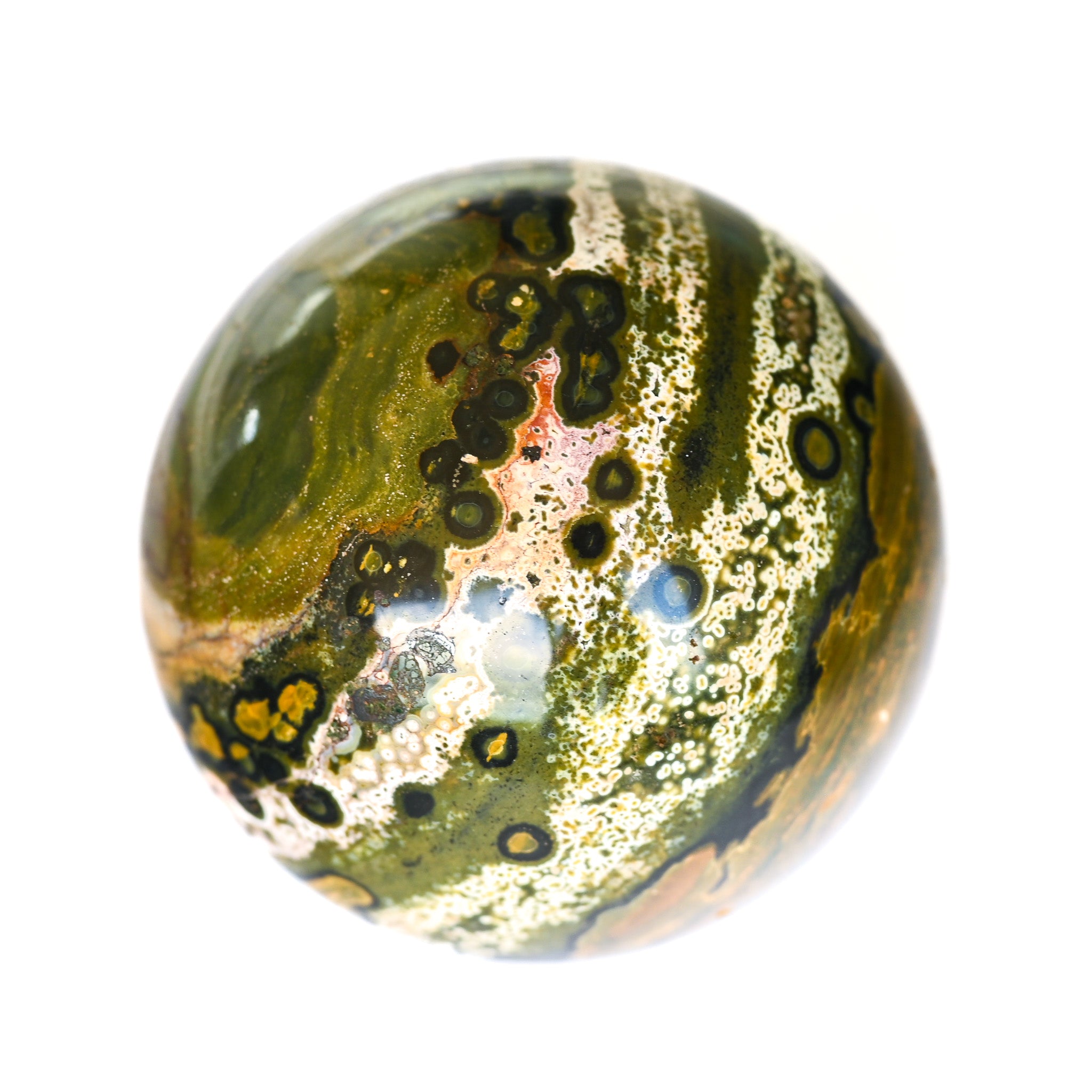 En lithothérapie, le jaspe orbiculaire est une pierre au pouvoir mystique. Pierre de renouvellement, elle nous rappelle que la nature est cyclique, rythmique et fluide. Il résonne avec tout ce qui agit en cycle et nous rappelle l'interconnexion de toutes les choses entres elles. Le Jaspe orbiculaire nous aide à faire face au changement à venir et à rendre service à l'humanité.