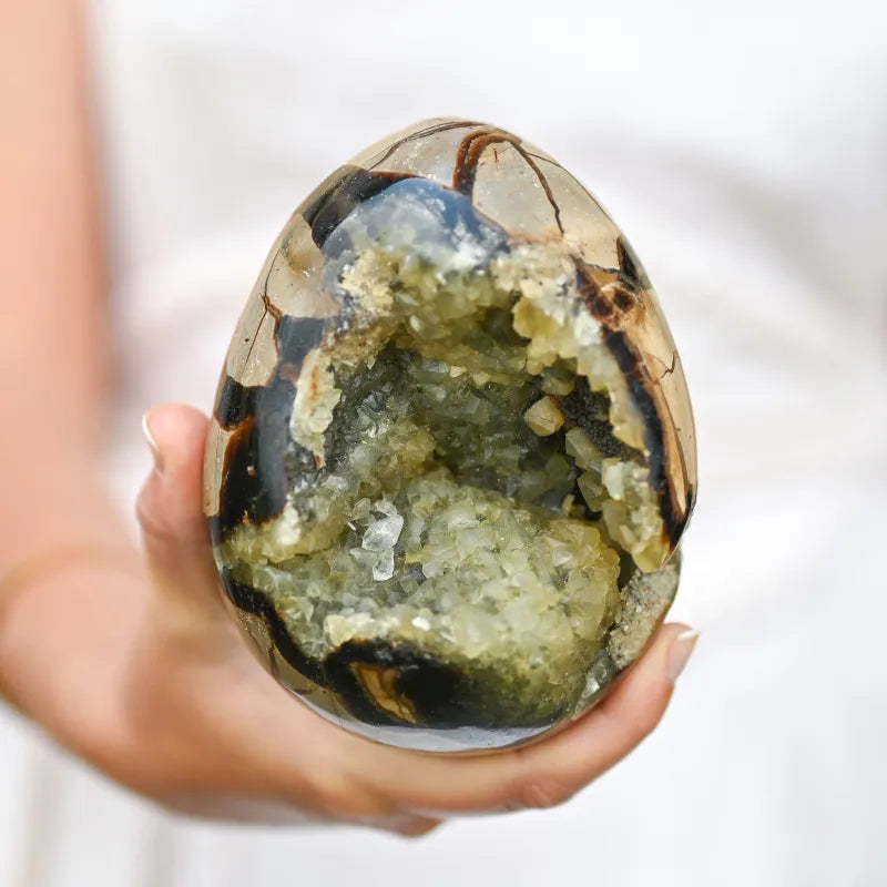 Les Septarias sont appelées aussi "Pierre du Dragon". Composées de calcite et de baryte cristallisées dans une matrice marneuse, les Septarias "sauvages" sont des septarias ouvertes, dans lesquelles ces minéraux ont pu cristalliser.